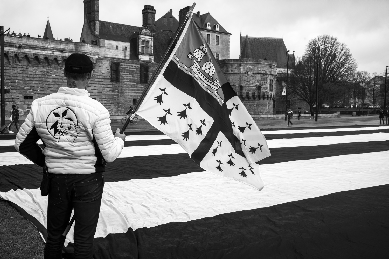 Nantes le 20-02-2022 : Déploiement du plus grand Gwenn-ha-du au monde - 1400m² - devant le château des ducs de Bretagne pour interpeller les candidats à la présidentielle 2022.
